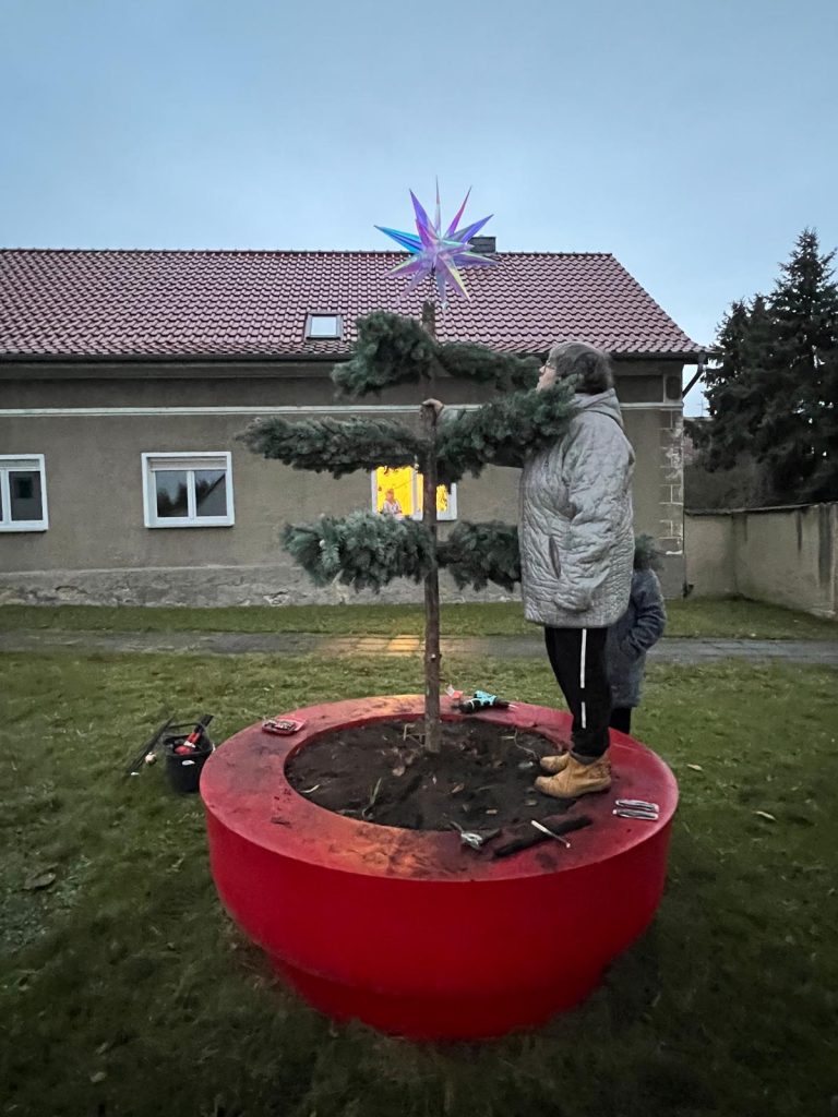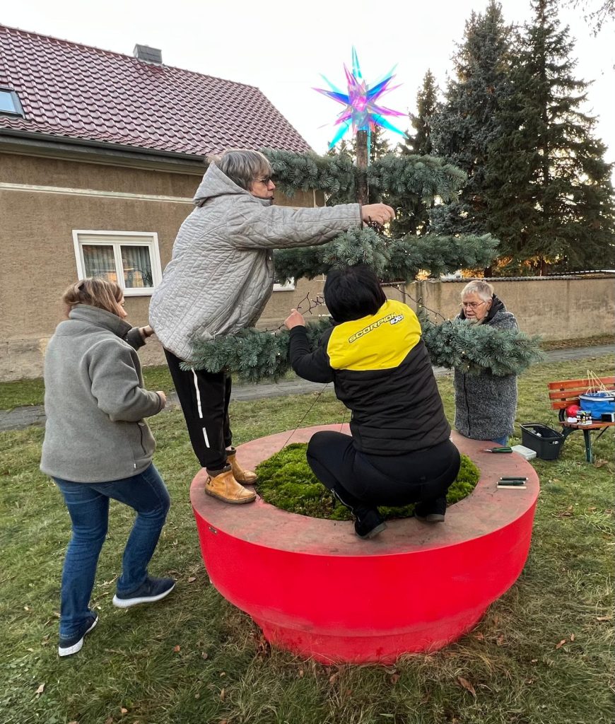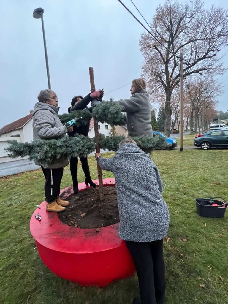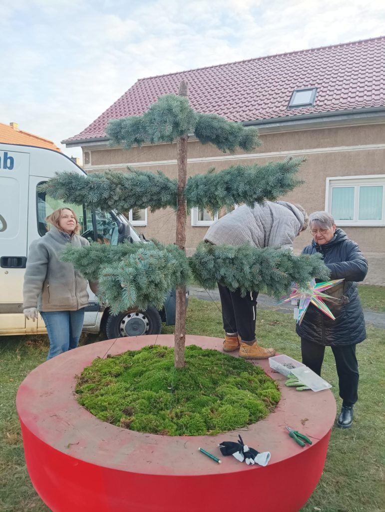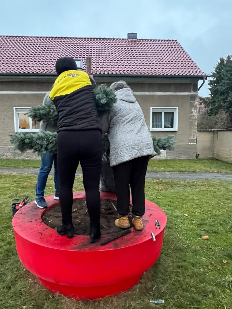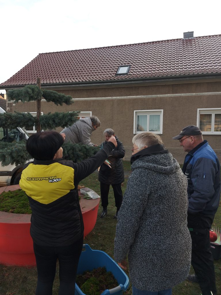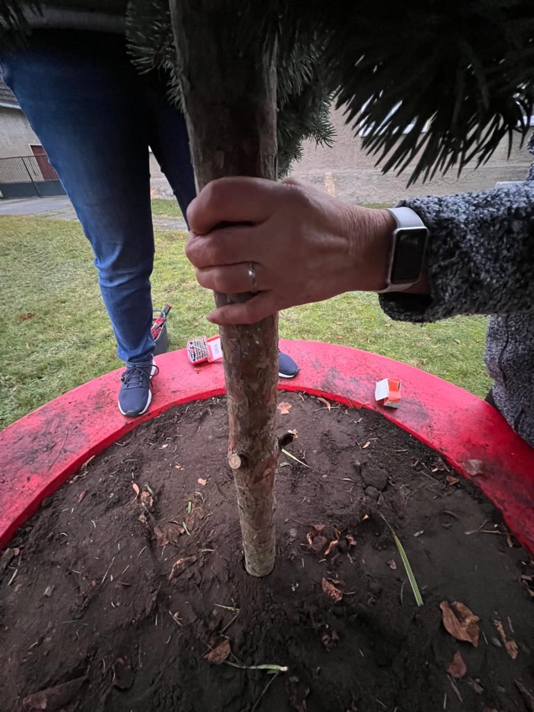 Nach der Osterkrone sollte es nun ein weihnachtliches „Etwas“ sein. Also ein Tannenbaum, was sonst. Nach intensivem Brainstorming war klar, was es werden sollte. Unter fachmännischer Anleitung von Kerstin und Veronika der Floristikchefin, machten wir uns ans Werk. Der ehemalige Verlobte unserer Ortsbürgermeisterin musste das Erdwerk im Blumenkübel erneuern, Veronika (von Allen liebevoll Vroni genannt) hatte schon die Äste mit Tannengrün geschmückt und die Bauleiterin Kerstin übernahm das Kommando. Sie war verantwortlich für den guten Stand unseres Kunstwerks und hatte auch schon die Deko besorgt.