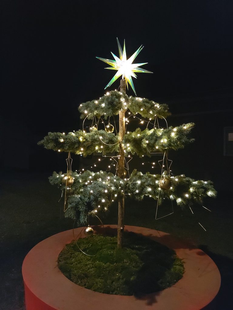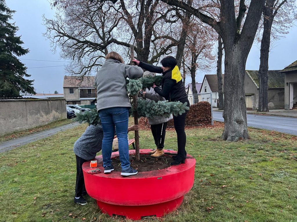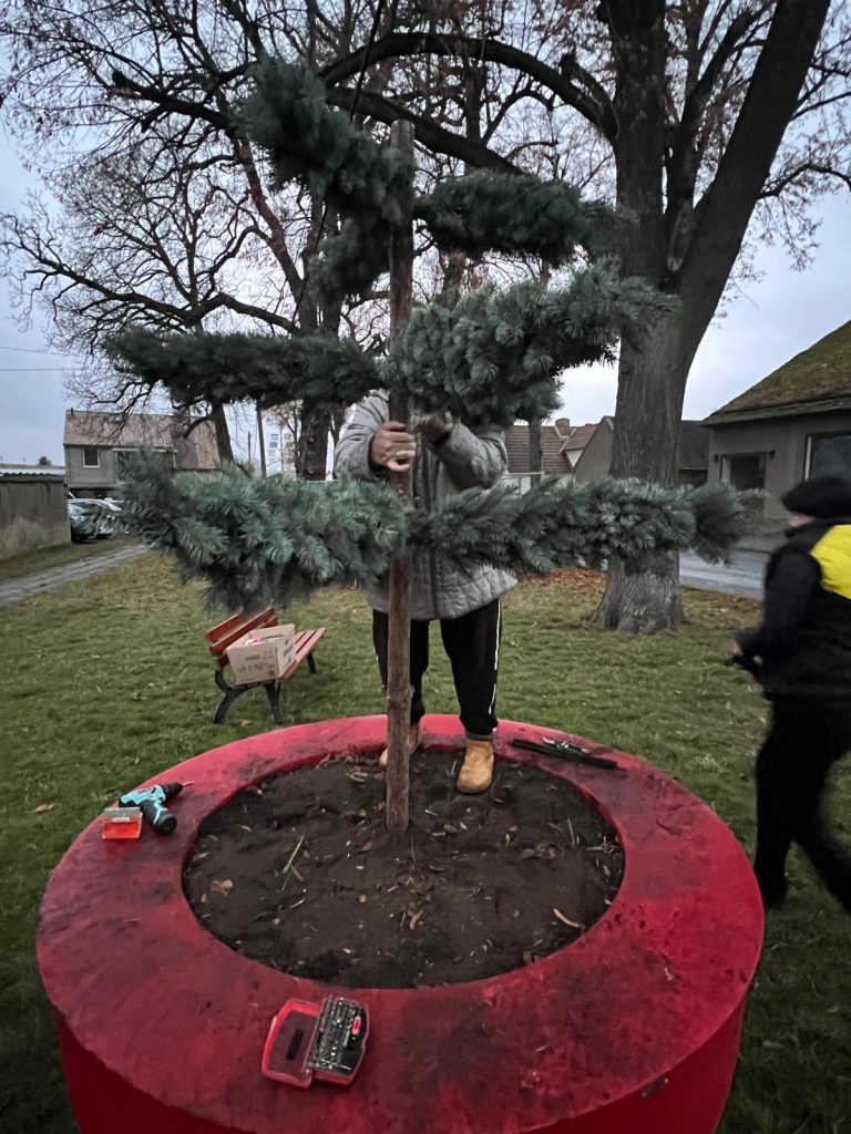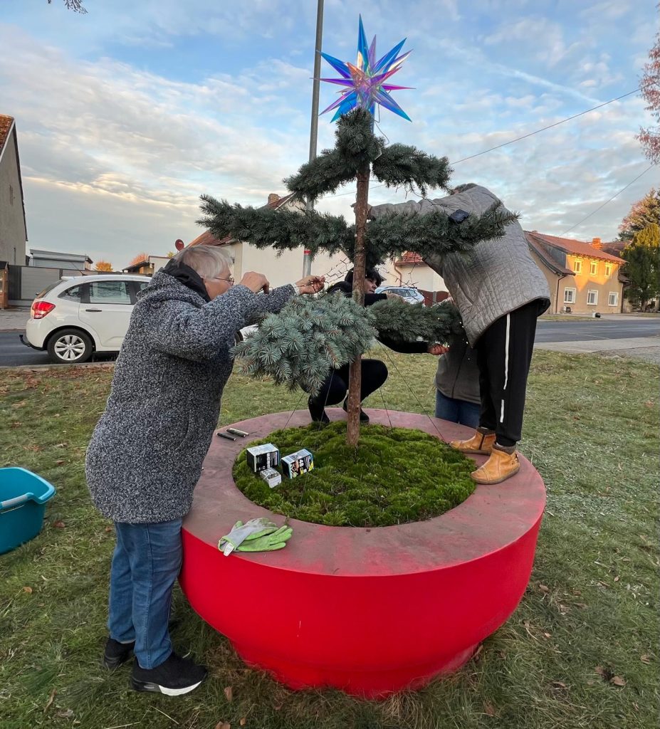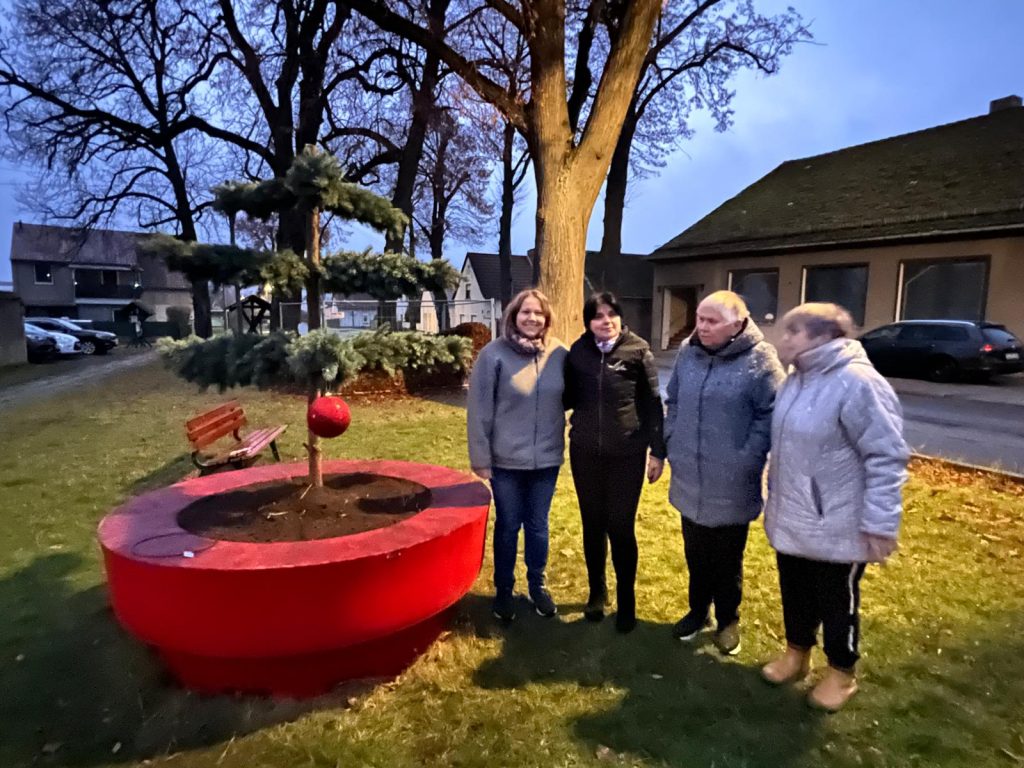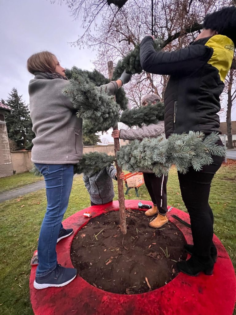 Nach der Osterkrone sollte es nun ein weihnachtliches „Etwas“ sein. Also ein Tannenbaum, was sonst. Nach intensivem Brainstorming war klar, was es werden sollte. Unter fachmännischer Anleitung von Kerstin und Veronika der Floristikchefin, machten wir uns ans Werk. Der ehemalige Verlobte unserer Ortsbürgermeisterin musste das Erdwerk im Blumenkübel erneuern, Veronika (von Allen liebevoll Vroni genannt) hatte schon die Äste mit Tannengrün geschmückt und die Bauleiterin Kerstin übernahm das Kommando. Sie war verantwortlich für den guten Stand unseres Kunstwerks und hatte auch schon die Deko besorgt.